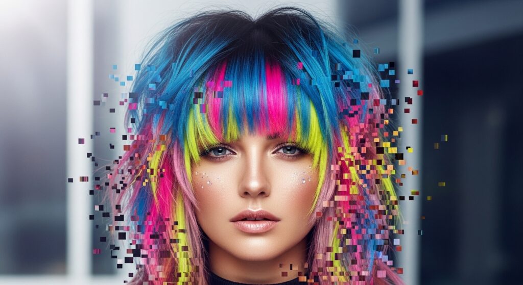 Glitchy glam hair is all about intentional texture and broken color. Apply that to your bangs! Ask for them to be cut in very distinct, piece-y sections.