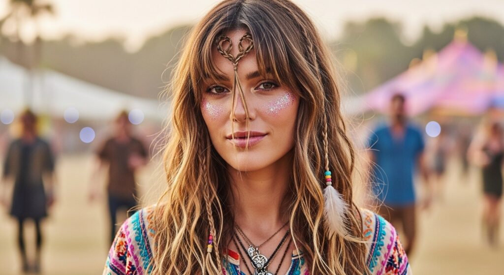 This keeps hair out of your face while still using the bangs’ shape to flatter. It’s a cute, boho detail that makes the style feel special and personal.