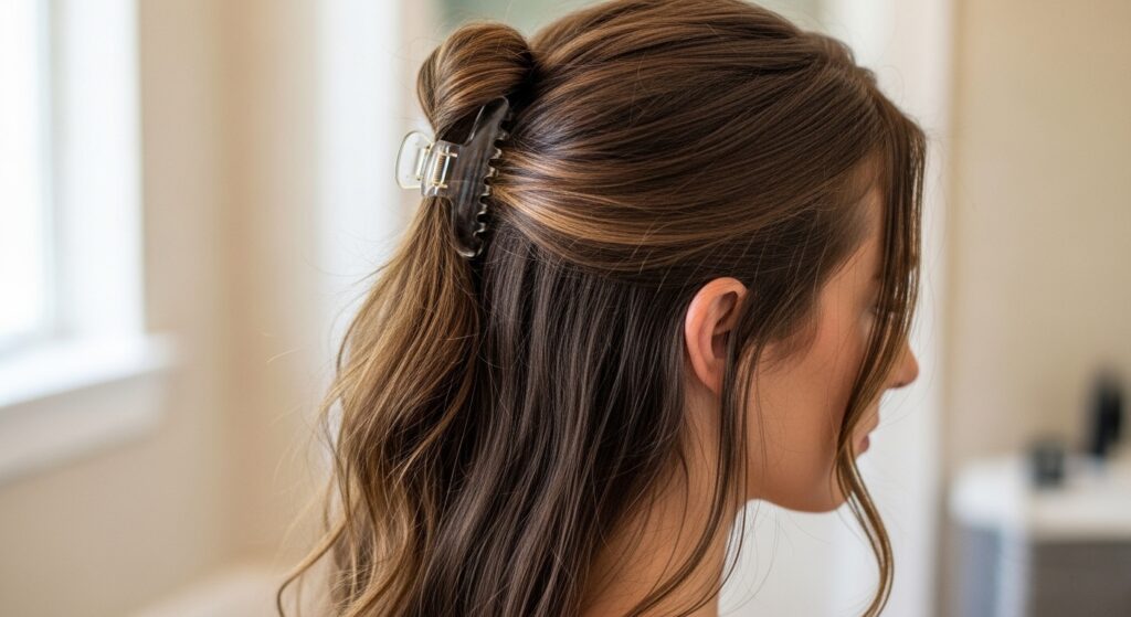 Once your hair is about 70% dry, take a section at the crown. Gently backcomb it at the root with your fingers just once for texture. Then, clip it up and out of the way with a jaw clip.