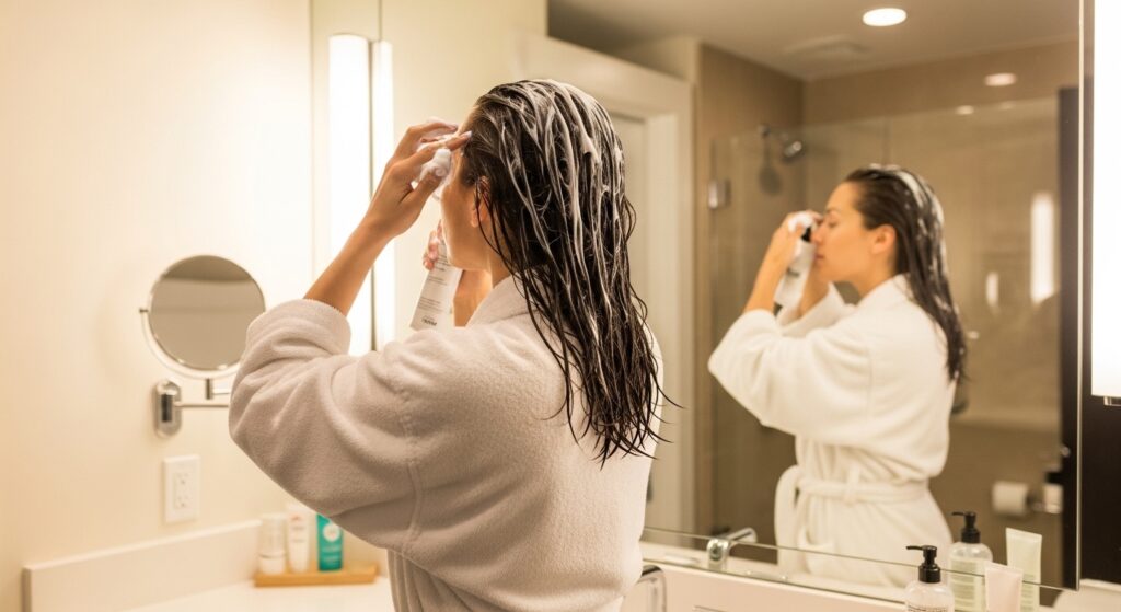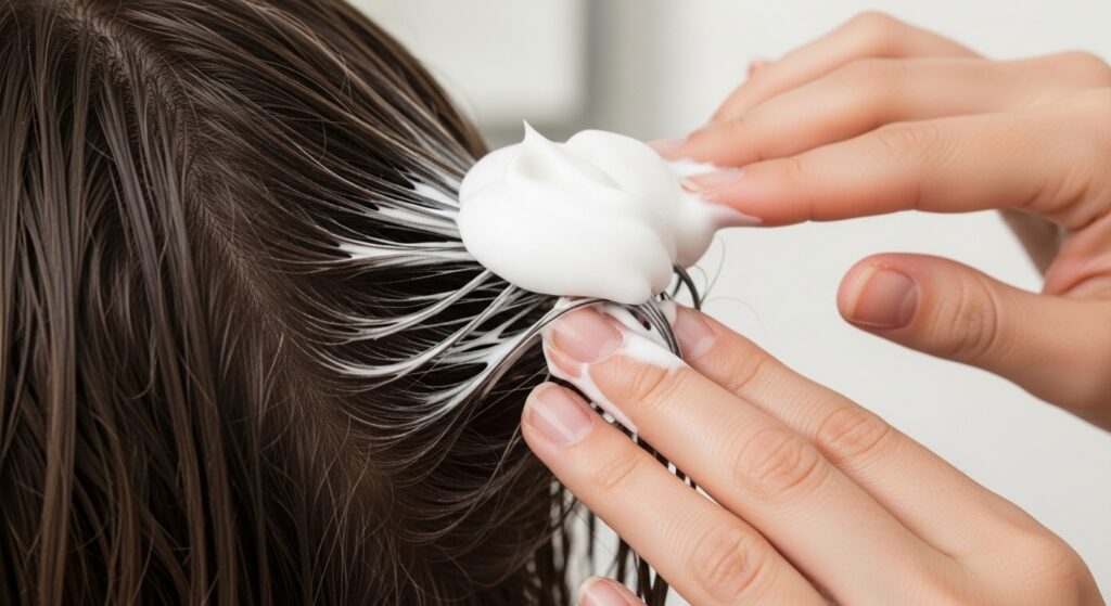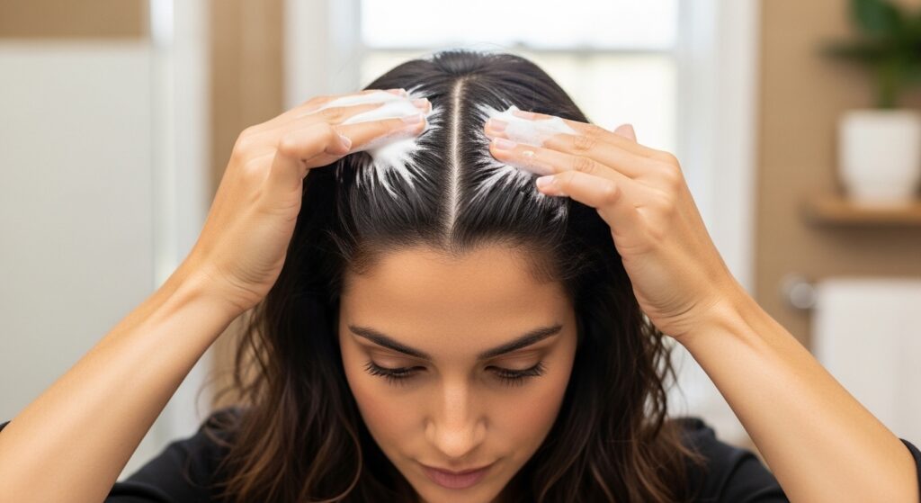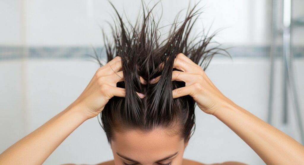 After applying generally, go back for strategic volume. Flip your head over. Take a second, smaller amount of mousse and focus it directly on your roots at the crown.