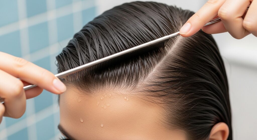 That sleek, polished volume seen in old money hair aesthetics starts with a perfect part. Before you dry or style, use a comb to set your part with the mousse already in.