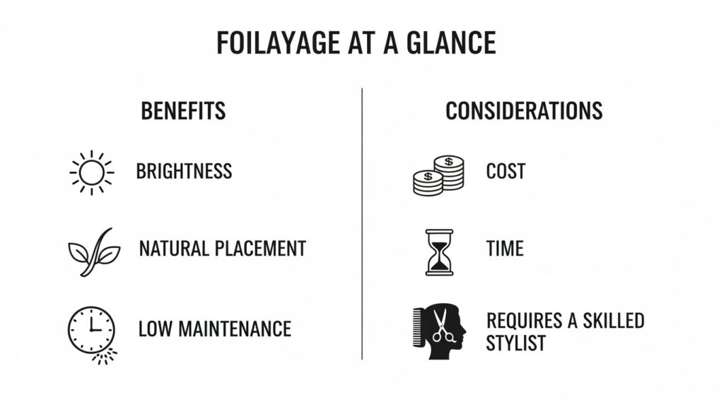 As for considerations, Foilayage is generally a more time-consuming and advanced technique, which can make it a higher investment than standard foil packages. It requires a colorist with a keen artistic eye and technical skill in both balayage painting and foil application. The results are also more permanent than a gloss or glaze, so it’s a commitment to a lighter look. Always book a consultation with an experienced professional to discuss if your hair history and goals align with what Foilayage can achieve.