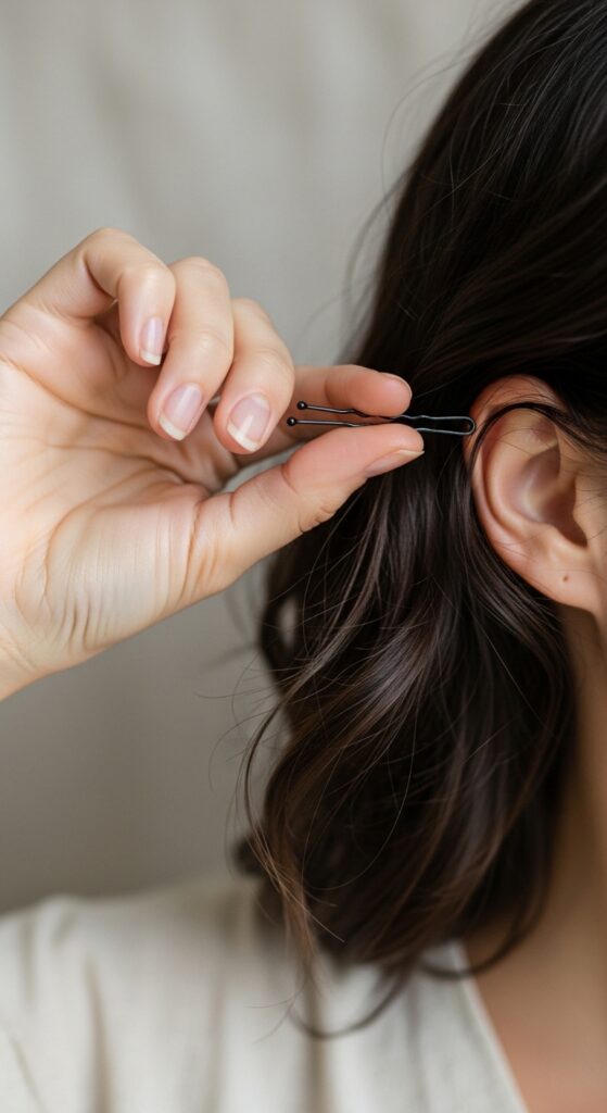 Gently twist the section away from your face just once or twice—no tight curls! Loosely tuck the twist upward against your head and secure it with a bobby pin, pushing the pin in the opposite direction of the twist for hold. Repeat right next to it for Pin 2.