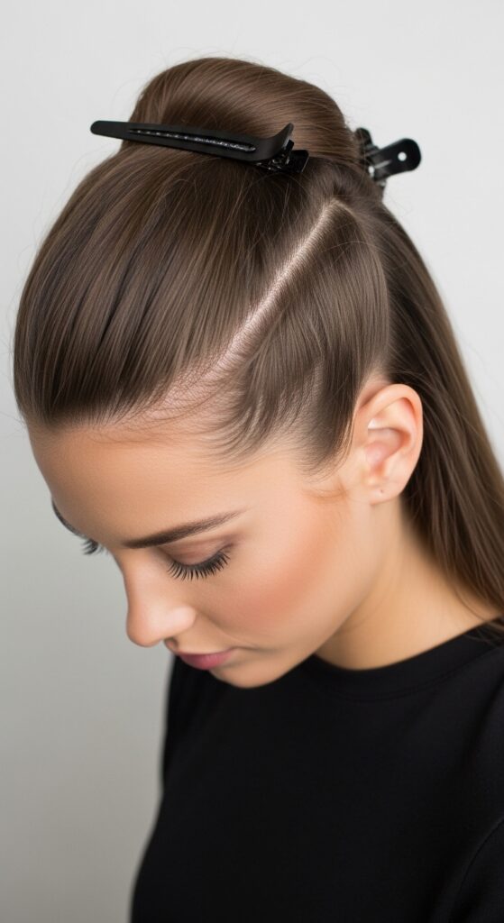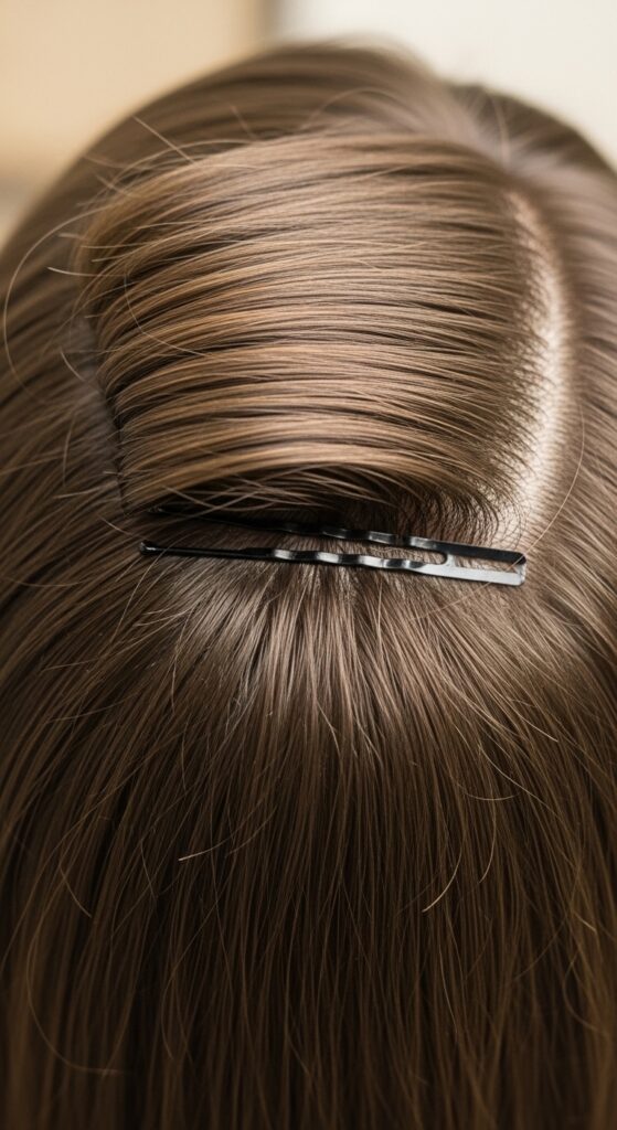 Don’t just start pinning randomly. Sectioning is what makes this method foolproof. Start by parting your hair as you normally wear it. Then, using your comb, create a part from ear to ear across the crown. Clip the top section up.