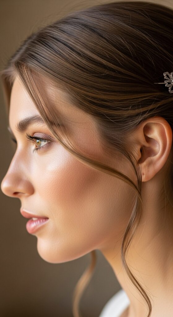 This gently pulls the hair back for that elegant, off-the-face look while leaving some soft pieces free. It’s the perfect finish that makes the style feel intentional, not messy. It works beautifully with trends like the asymmetrical lob or even a hime cut.