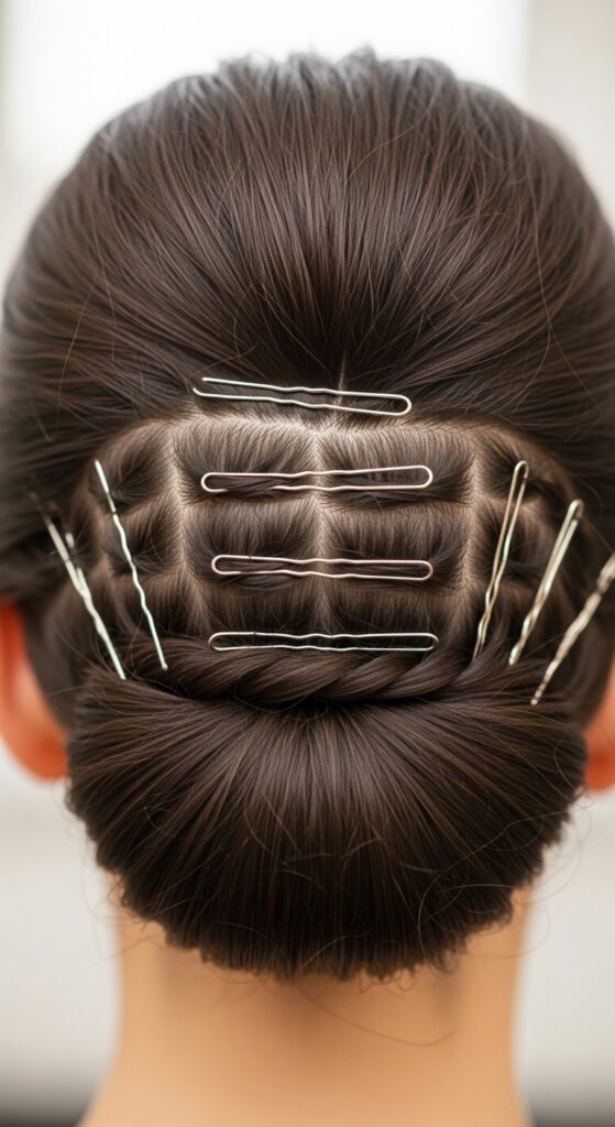For each pin, remember: twist loosely, tuck upward, and pin securely. This base layer is the foundation for your volume. Don’t rush it. Once this lower half is done with 6 total pins, you’ll already feel the lift.