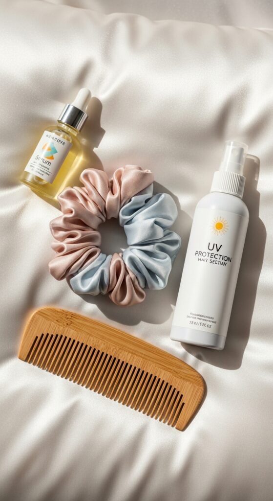 Pair your treatment with these summer essentials: a wide-tooth comb for wet hair, a silk scrunchie for gentle updos, a UV-protectant hair spray, and your sulfate-free shampoo. A satin pillowcase is also a game-changer for reducing friction and preserving your style.