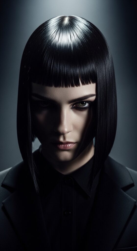 The vampire haircut—a dramatic, sharp lob with heavy fringe—relies on sharp lines and sleek texture. A keratin treatment makes maintaining this high-drama style simple.