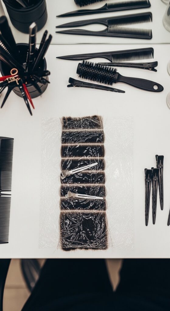 Measure the wrap against your hair section, leaving a little extra length. Always cut it slightly wider than the hair section to ensure full coverage. Sharp scissors are key for clean edges.
