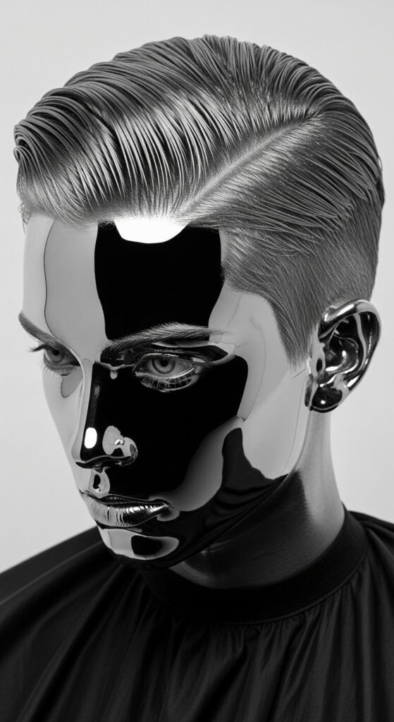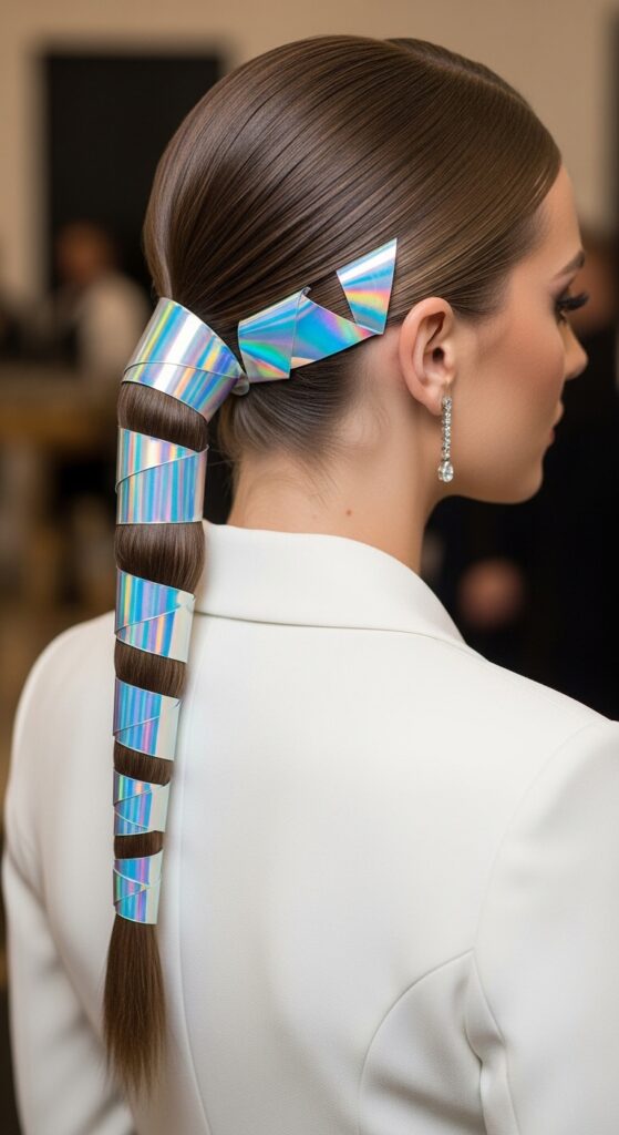 Think sharp, graphic, and ultra-modern. Use solid blocks of chrome or mirror-finish wraps on a severely parted style. Combine it with wet-look gel on the rest of your hair.