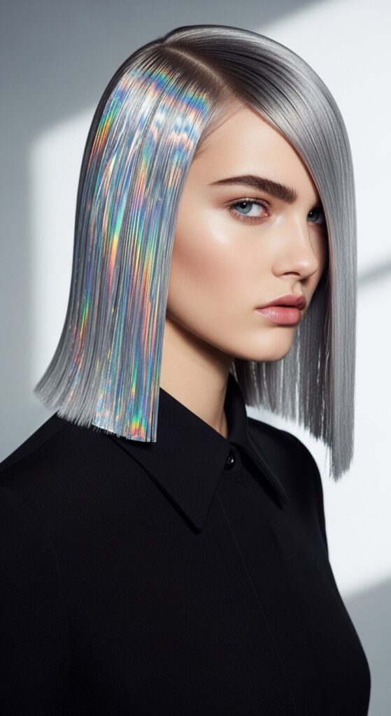 Pair it with waves for a soft, ethereal feel. The holographic sheen adds a mystical, otherworldly layer that’s perfect for a vampire haircut base.