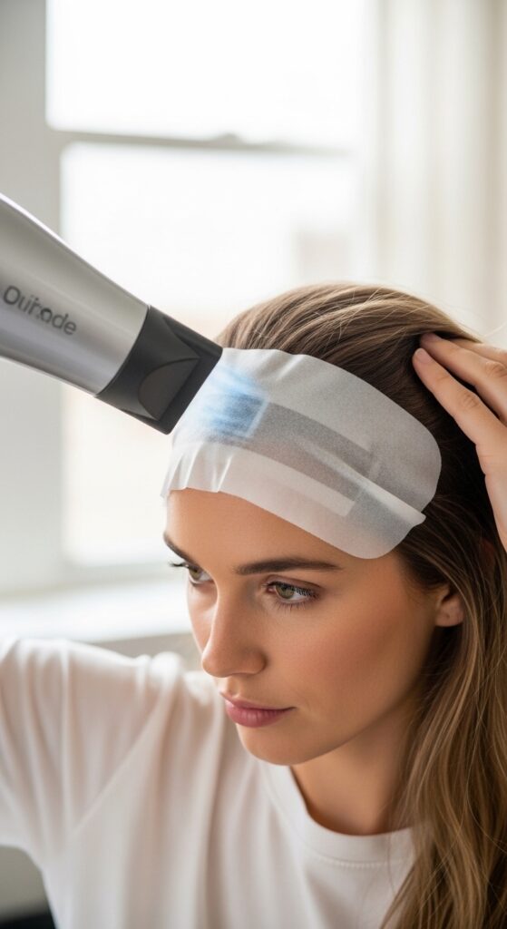 Once it’s smoothly applied, use the cool setting on your hair dryer to go over the wrap. The mild heat helps activate the adhesive slightly. Then, finish with a very light mist of hairspray over the area.