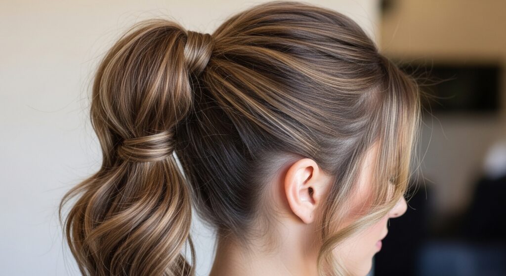 Use a coil-style hair tie for a better grip. After securing, gently pull at the hair above the band to lift the crown. Pull out a few baby hairs around your face. The texture makes it look effortless.