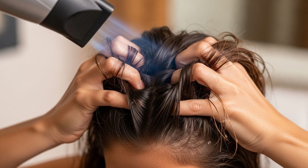 To avoid flat roots when air-drying, use small sectioning clips. While your hair is still damp, lift sections at the crown and front, and clip them at the root.