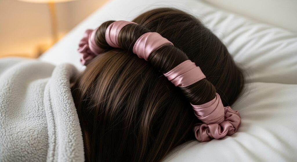 Sleep on a silk pillowcase to reduce friction and frizz. In the morning, unravel, flip your head over, shake it out gently with your fingers, and you’ll have beautiful, natural waves. A little texturizing spray can help define them.