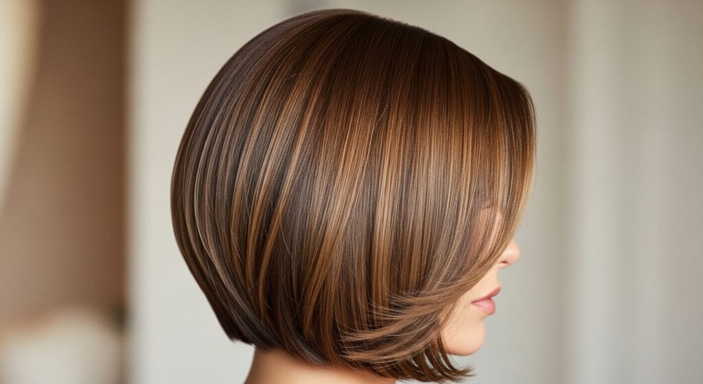 The quiet luxury bob is all about impeccable, shiny texture. Achieve this by blow-drying with a round brush, directing the hair under.