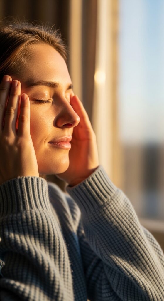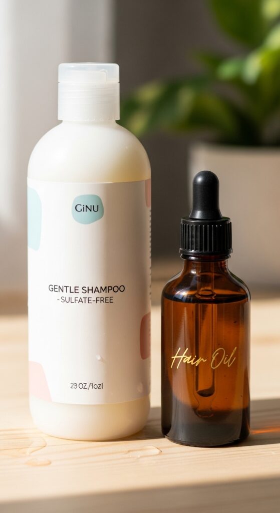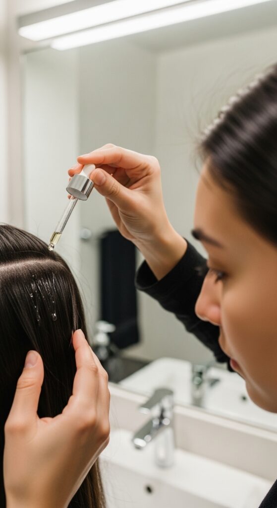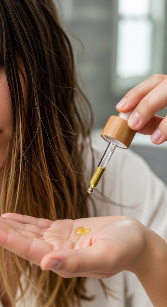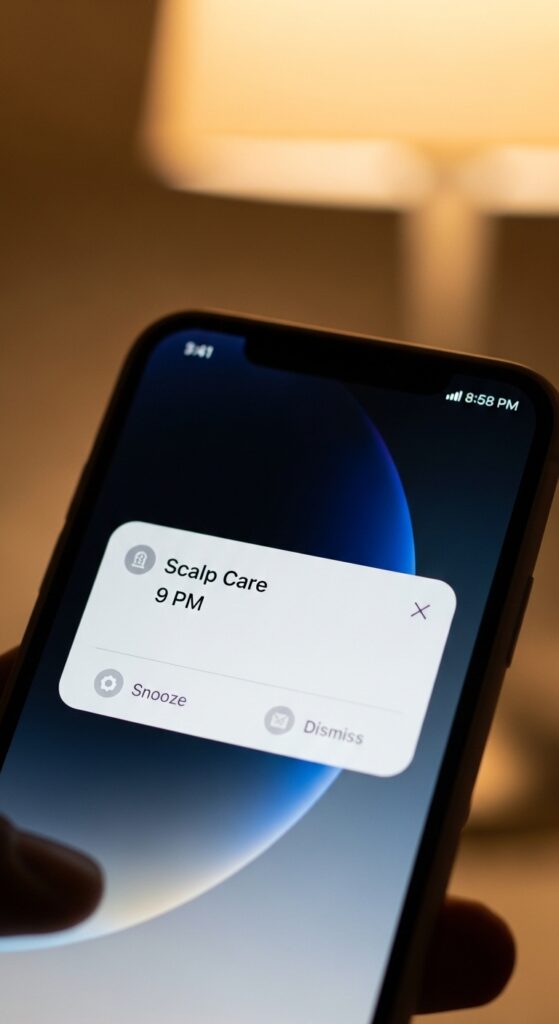 I keep my oil bottle on my nightstand so I remember. After I wash my face and do my skincare, I take 60 seconds for my scalp. I part my hair in four sections, drop a little oil along each, and massage.