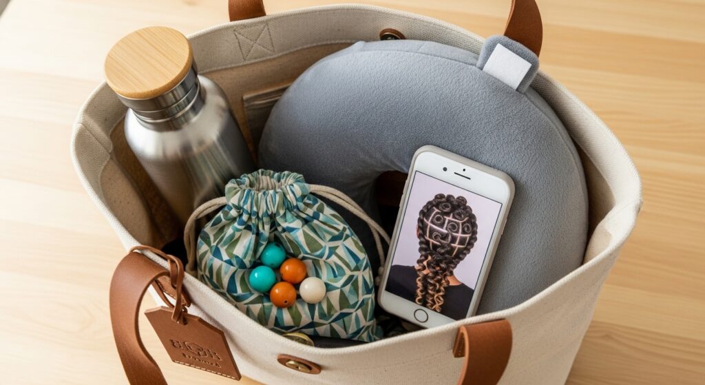 Being prepared makes the day easier. Pack a kit with your own hair products if you have sensitivities. Bring your inspiration photos and your chosen beads if you bought them separately.