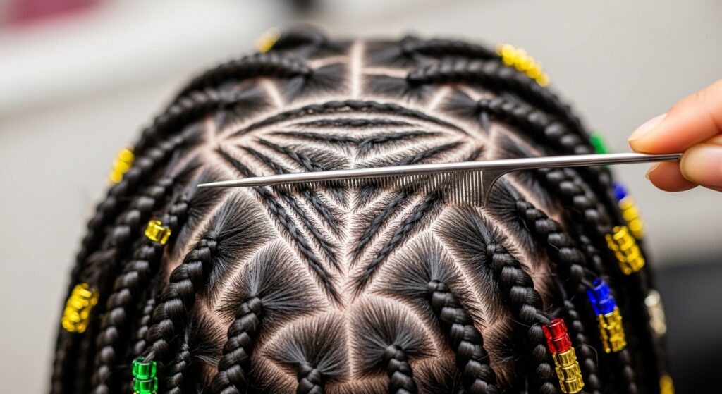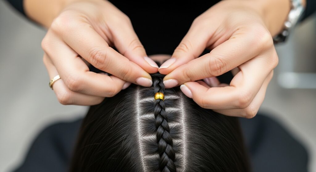 Your stylist will start by sectioning your hair, usually creating a central part and then building the cornrow patterns outward. The tension should be firm but not painful—speak up if it hurts!