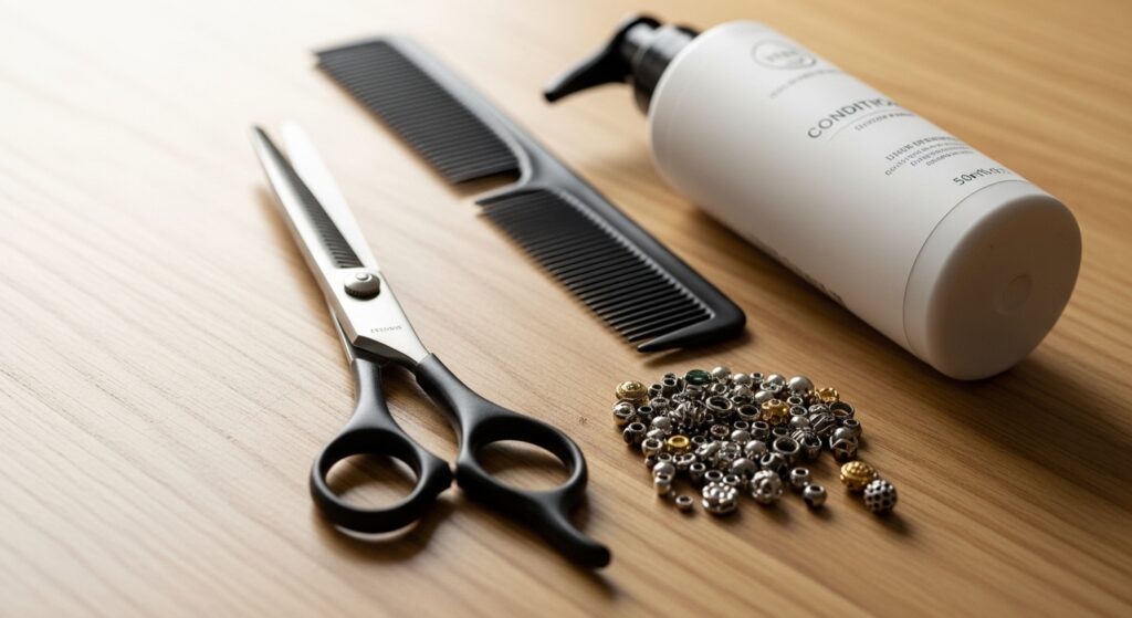 - Gather Supplies: Sharp hair shears, a tail comb, conditioner, and detangling spray.