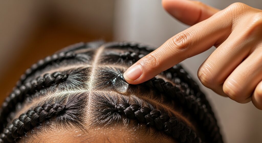 Gently clean along your parts with a cotton pad and some witch hazel to remove buildup. The goal is freshness without disturbing the braids.