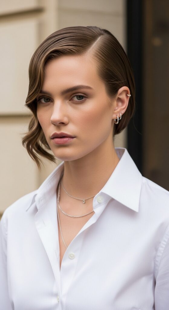 Pair it with a simple middle part, sleek behind the ears, or a low, polished ponytail. The focus is on impeccable condition and subtle shine. It’s less about trend and more about timelessness.