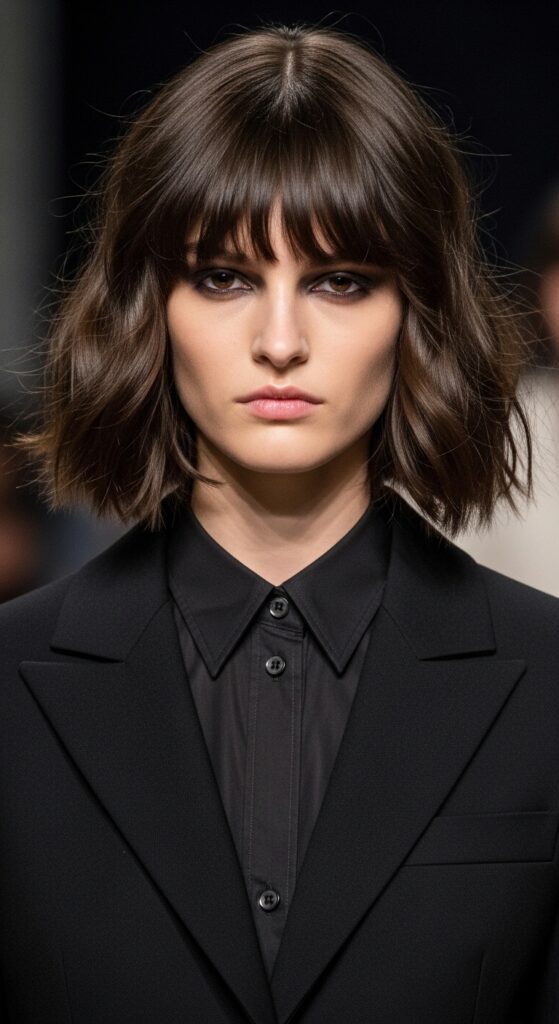 The vampire haircut—sharp, blunt, and often with curtain bangs—gets a major upgrade with this length and wave. The waves soften the bluntness just enough.