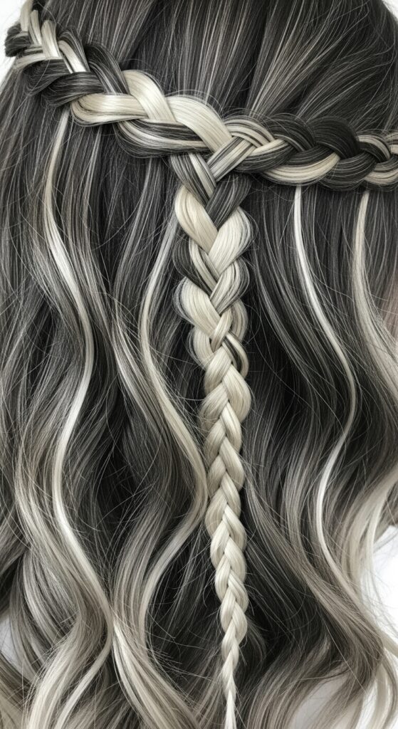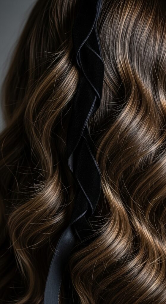 Add some face-framing pieces, a deep side part, and maybe a few delicate black ribbon accessories. It’s soft and ethereal but with a dark, moody palette. The hair provides the perfect romantic texture.