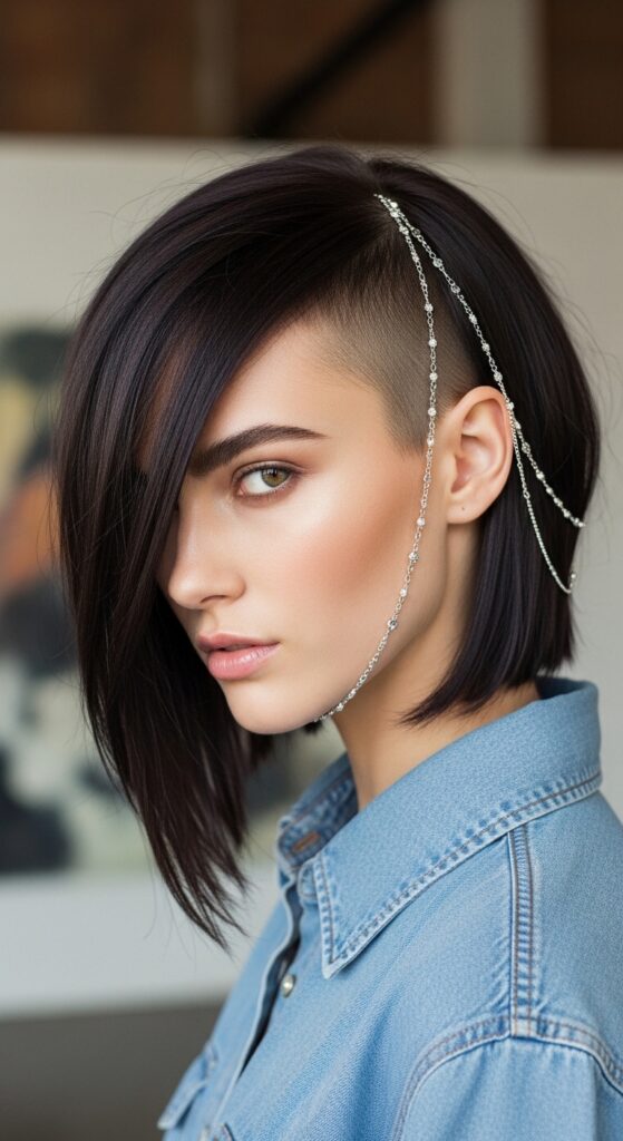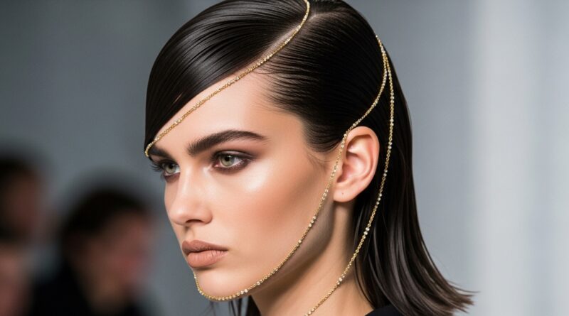 An asymmetrical lob or a sharp vampire haircut creates a cool, edgy base for sparkle. Even a precise hime cut or a sleek quiet luxury bob can be transformed with a delicate chain placed over the blunt lines. It’s all about contrast.