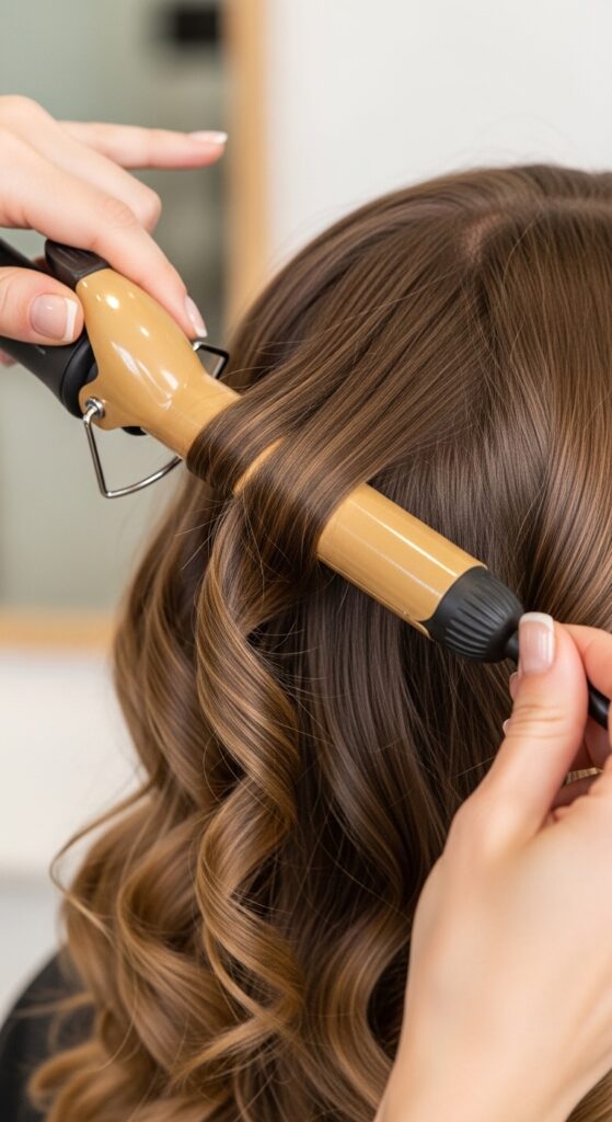 You don’t need perfect curls. In fact, slightly messy, lived-in waves are better. I use a 1-inch curling wand, wrapping random sections away from my face. The key is to not curl all the way to the roots and to brush them out with your fingers.