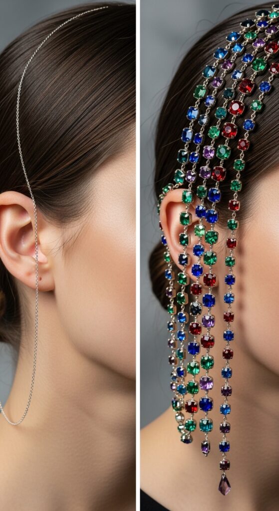 Your chain’s impact depends on the size and sparkle. A thin chain with tiny clear crystals is your “my hair but better” accessory. It catches the light only when you move. This is perfect for a quiet luxury approach.