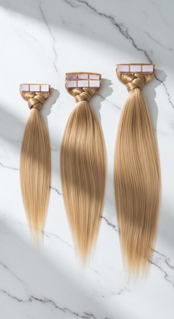 If your natural hair is at your chin, you might use a mix of 14″ and 16″ tapes. The shorter ones build the interior shape, and the longer ones create the lob line. For mermaid lengths, a mix of 20″, 22″, and 24″ is stunning.