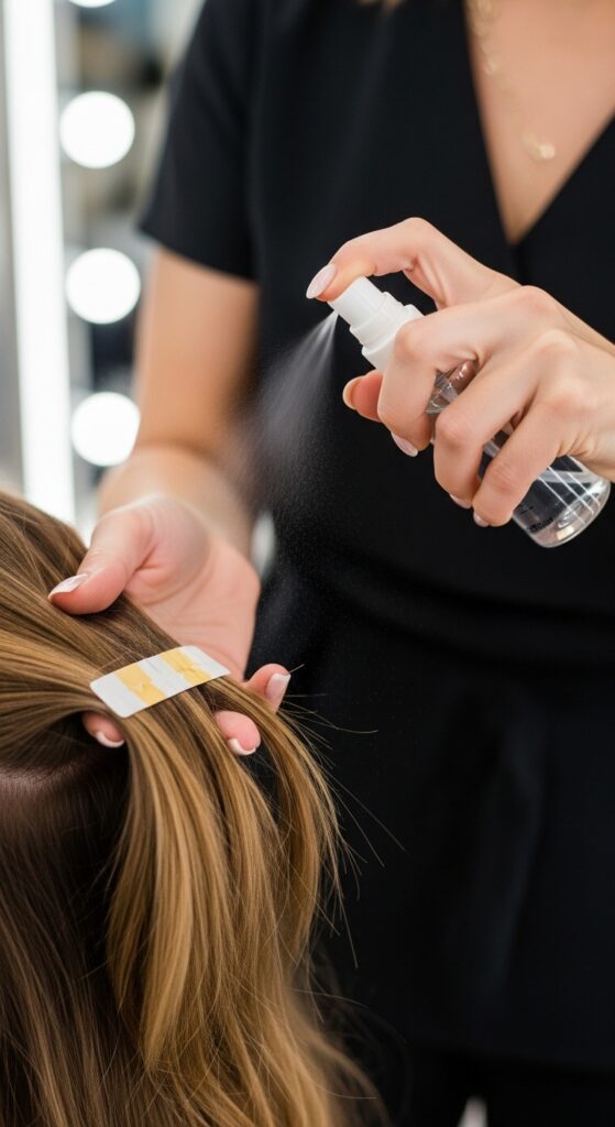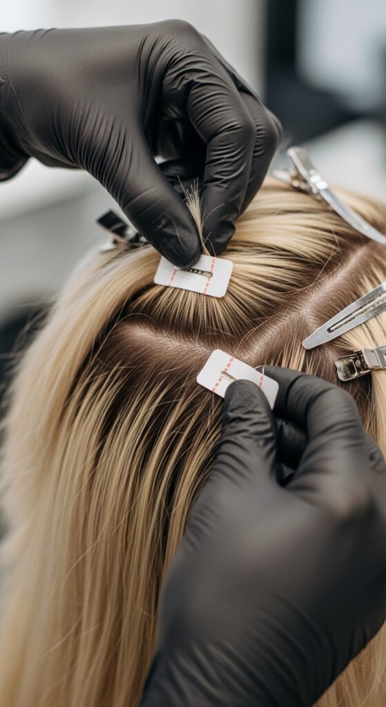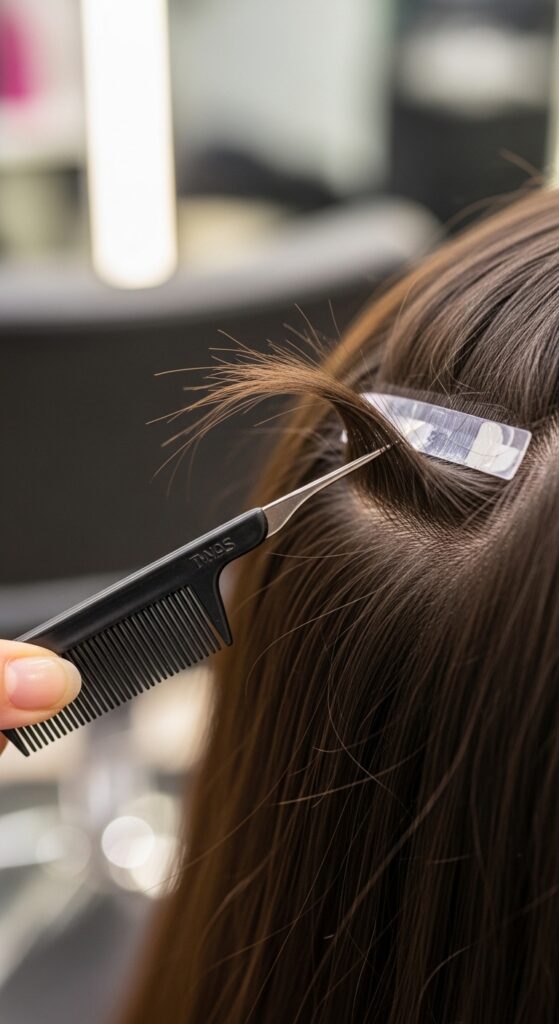 That’s your sign it’s time for maintenance. Don’t wait longer, as the tapes can start to twist or tangling can occur. The move-up process is quick—your stylist removes the old tapes, cleans the adhesive residue, and reapplies fresh tapes closer to the root.