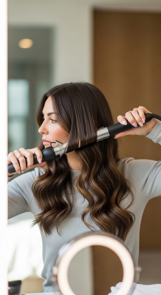 The beauty of a well-layered set is that styling becomes easy. Your goal is to treat all the hair as one. Always use a heat protectant. To create soft, blended waves, wrap large sections around a curling wand, alternating directions.