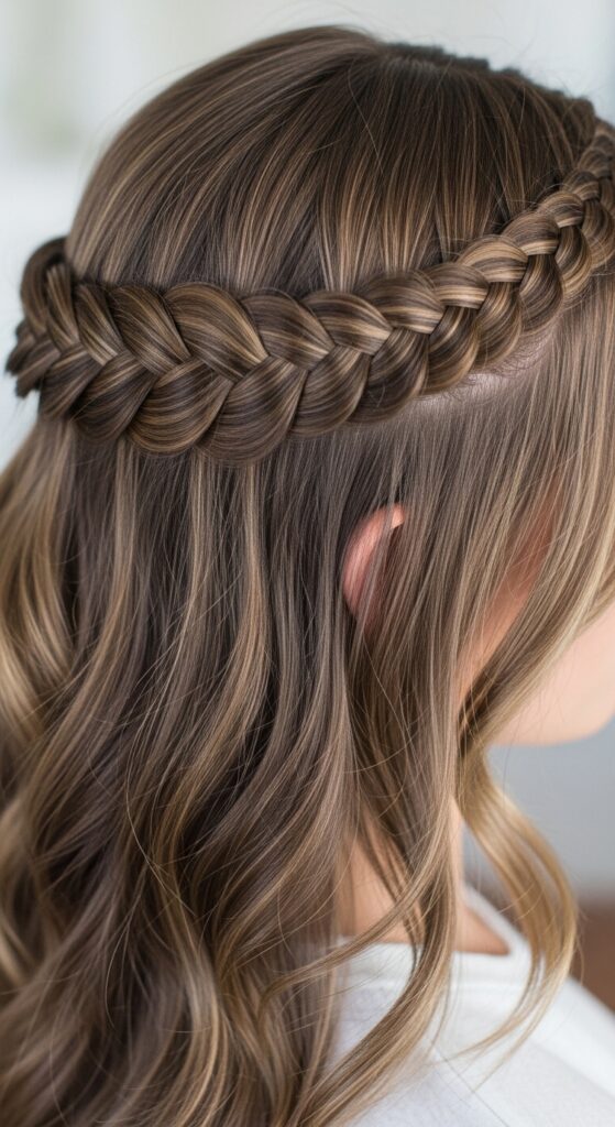 Channel some romantic goth hairstyles for inspiration. This aesthetic loves deep parts, braids, and pieces pulled back from the face with dramatic accessories.