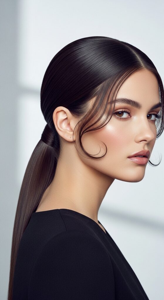 Don’t underestimate a sleek, low ponytail. Apply a smoothing serum, brush all your hair back, and secure it low at your nape. Use the tail of a comb to gently pull out the tiniest wisps around your face.