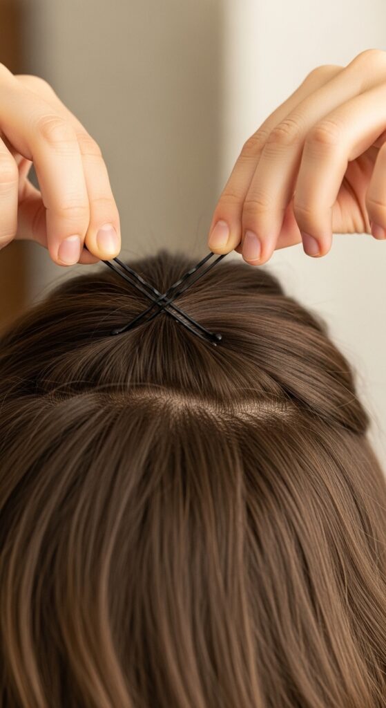 Cover the pins by pulling down a few wispy strands. This gives you the appearance of a full, voluminous style without any fringe in sight.