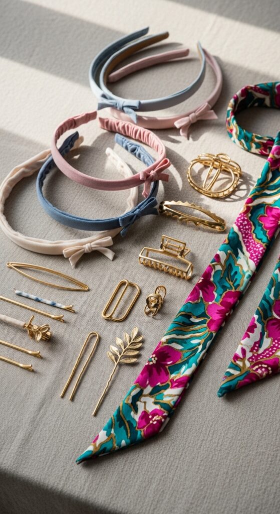 Headbands, scarves, and cute clips are not just for kids. A thin, fabric headband can hold back the shortest pieces. A silk scarf tied as a headband adds a chic touch.