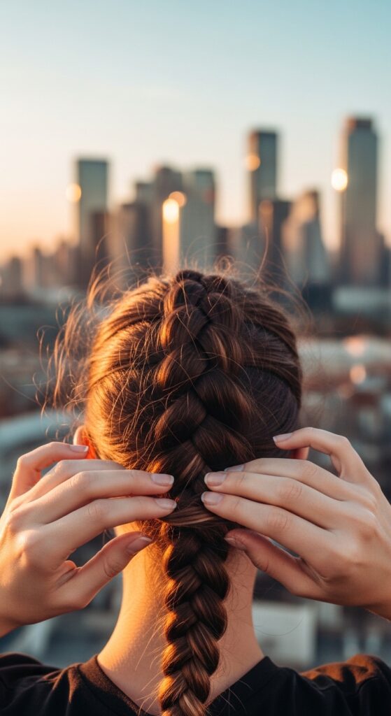 Then, gently run your hands down the length of the braid, applying light pressure. This smooths the frizz and re-seals the style without making it crispy. It’s a game-changer for textured, glitchy glam hair looks.