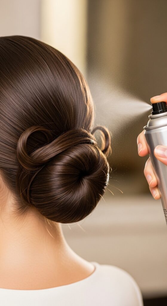 Hold them in place and give them one quick spritz. Let go once dry. They’ll now have a gentle, set shape that resists blowing straight out, keeping your updo looking neat.