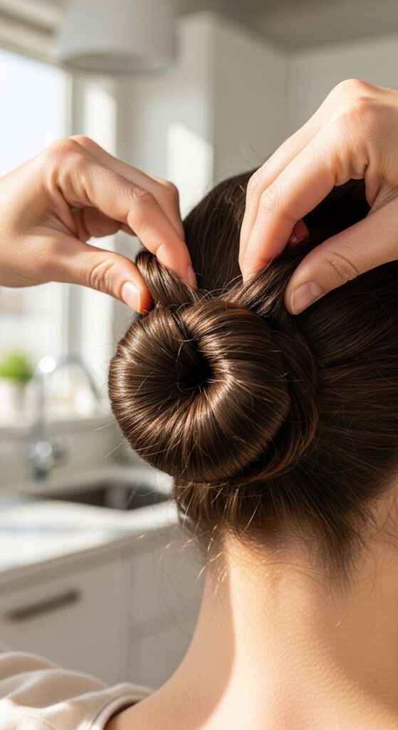 - Twist the ponytail and wrap it around the base, forming a bun shape.