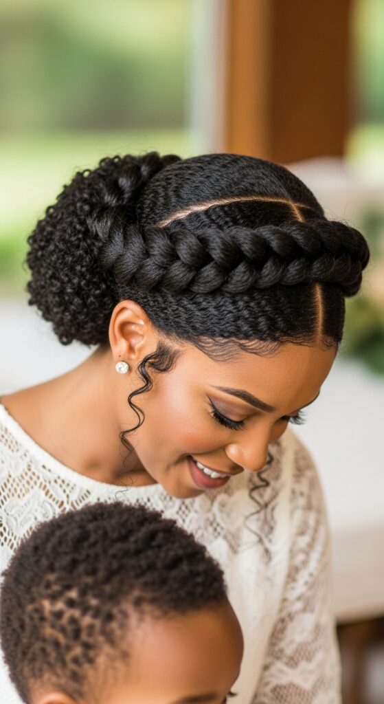 This style distributes the weight of your hair evenly around your head, so it doesn’t pull or create a headache. It also keeps every strand completely off your face and neck—a major win during messy playtimes or hot days.