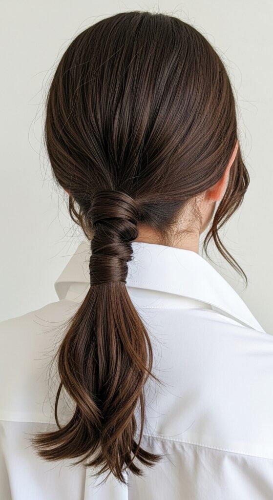 Elevate your basic low ponytail with a simple twist that adds style and security. This method prevents the ponytail from sagging throughout the day and makes it look intentional and chic. It’s a 10-second upgrade.
