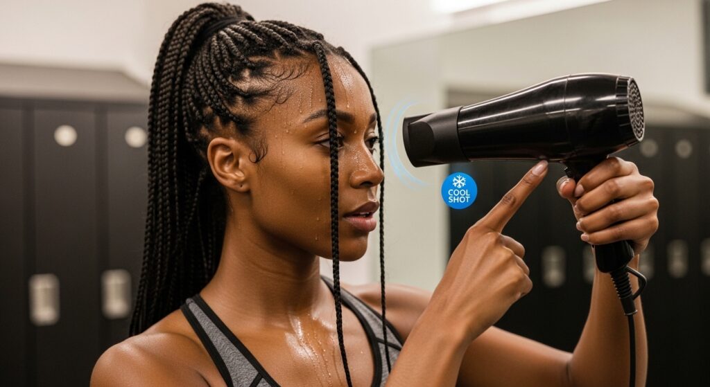 Heat opens the hair cuticle, letting moisture in. Cold air seals it shut. After your workout, if your roots are damp, hit them with the cold setting on your blow dryer for 60 seconds.