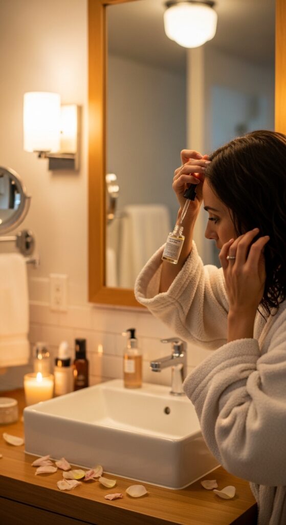 Application is key! You want to make sure you’re targeting the right areas without over-saturating your hair. Here’s my simple nightly routine.