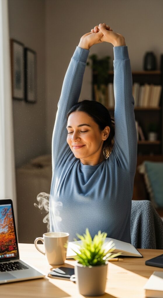 Stand up and stretch, reaching your arms overhead. This simple act changes your energy, improves your posture, and can literally make your hair look livelier because you are.