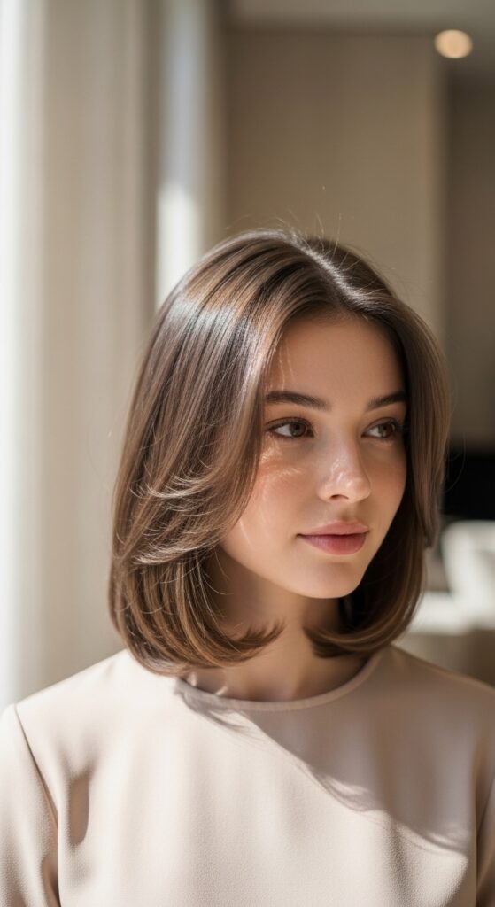 This reflective, healthy look draws a clean line around the face. It’s not about big volume, but about perfect condition and a precise shape that looks expensive and tidy.