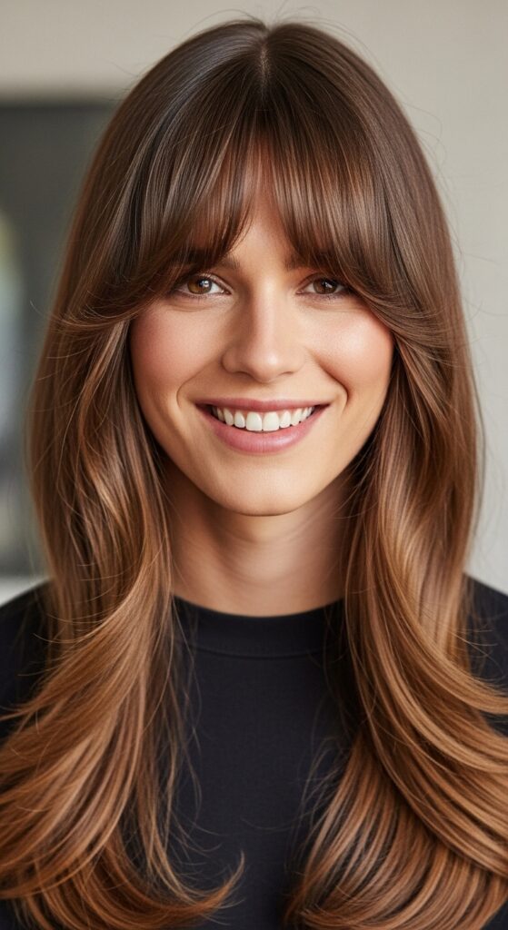 Curtain bangs are the ultimate framing tool. They part perfectly in the middle and taper down to graze your cheekbones, creating a soft, flattering V-shape that leads directly to your jaw.