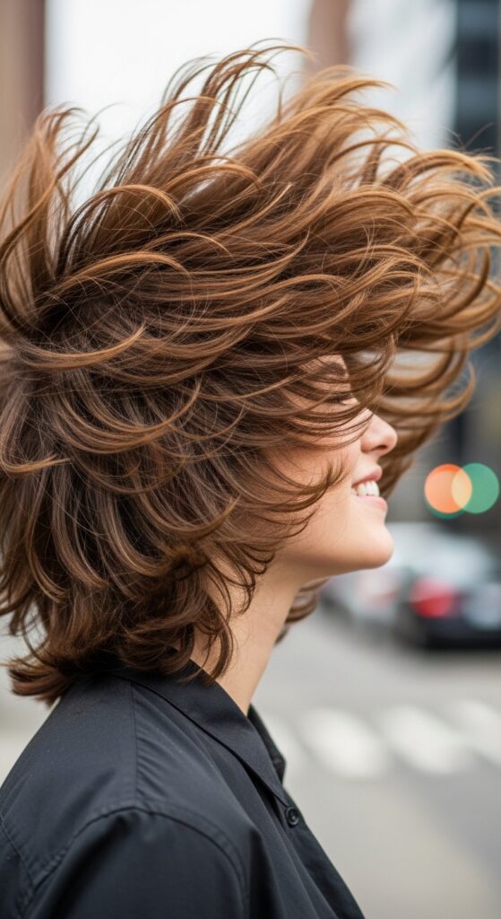 A modern shag is layered from the crown all the way down. This means volume and movement start high up, which is the key to a lifted look.