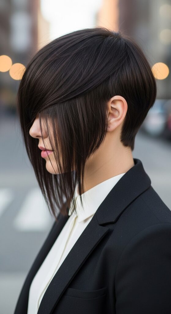 This diagonal line is inherently eye-catching and pulls the gaze upward along its path. It’s a modern, fresh take on a classic cut that feels both edgy and sophisticated.